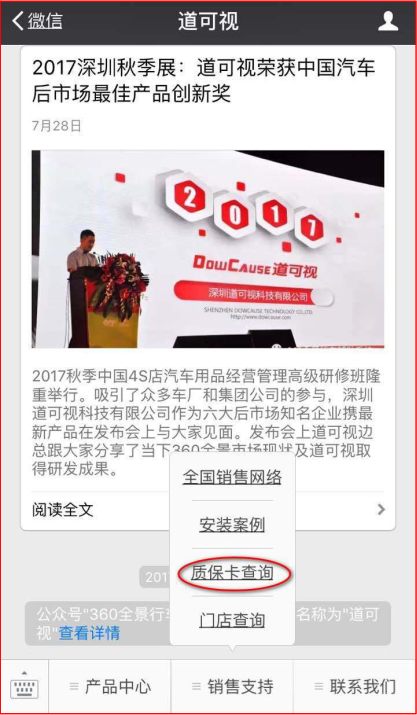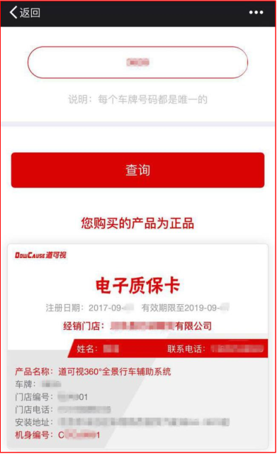 1、查詢(xún)產(chǎn)品真?zhèn)?/span>:通過(guò)電子質(zhì)保系統(tǒng)可以查詢(xún)到自己安裝的是否是道可視正品360全景,杜絕仿冒產(chǎn)品。