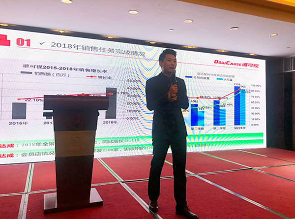 隨后深圳道可視科技有限公司銷(xiāo)售總監(jiān)邢偉發(fā)表了《道可視2018年度市場(chǎng)總結(jié)及新年計(jì)劃》主題演講,他表示2018年道可視銷(xiāo)售增長(zhǎng)率同比增長(zhǎng)31.11%,會(huì)員店數(shù)量開(kāi)發(fā)2128家,整體表現(xiàn)還是非常不錯(cuò)。